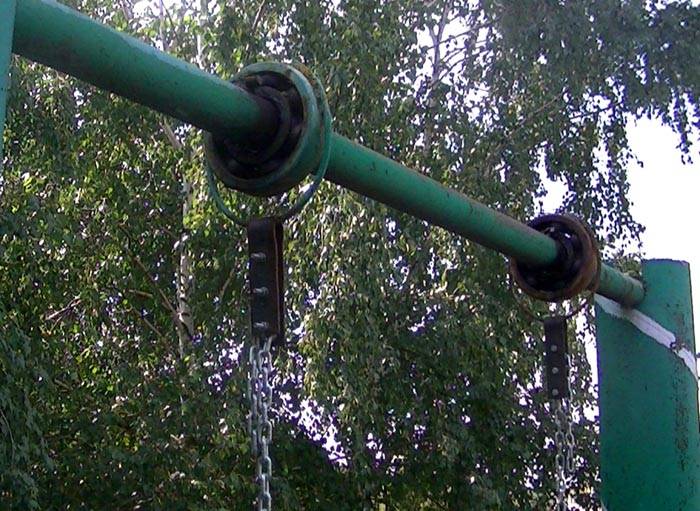 כאן מחבר הפרויקט השתמש בקרס עם תפס.הוא מספק התאמה בטוחה, אך אינו מעכב פירוק בעת הצורך. בדוגמה זו לא ניתן לציין רק יתרונות, אלא גם חסרונות. במגוון חנויות מתמחות, לא קשה לבחור רכיבים במטרה לעומסים מסוימים. אך הטבעת והוו בנקודת המגע יהיו כפופים ללבישה. שכבת הצבע תיהרס במהירות ויופיעו עקבות חלודה. אין שום דרך ללמוד כיצד לחסל חריקות במהלך השימוש עם חומר סיכה.