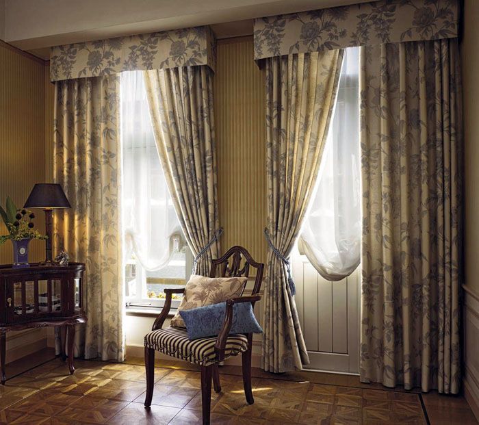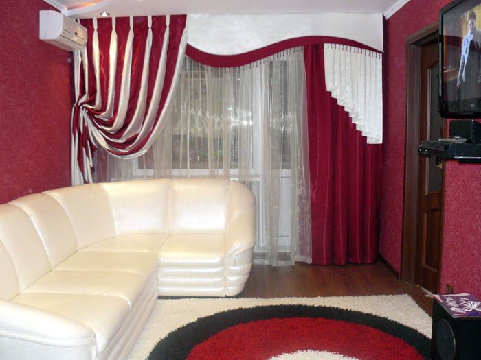 אם העיצוב הוא רב שכבתי, כלומר, הוא מורכב מווילון, טול בהיר או רעלה. כל זה מעוטר בלמברווינים וביריות יפהפיות. הניגוד של צפיפות הרקמות משחק תפקיד.