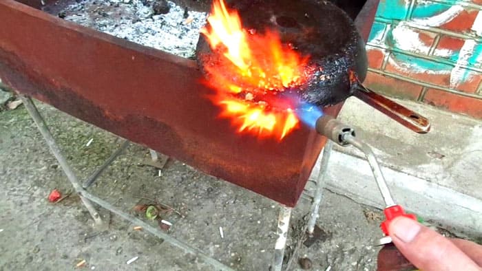 לביצוע הליך הניקוי התרמי, הכינו לפיד או לפיד. התהליך כולו צריך להתרחש באזור מאוורר היטב, אתה צריך לקחת ספוג תיל, לבנה ואגן מים קרים כדי לעזור.