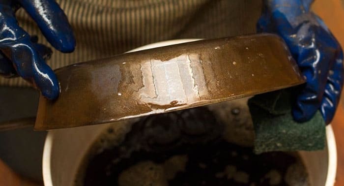 מים מוזגים לאגן רחב ידיים ומעלים אותם. עליכם להמתין עד שהמים ירתחו על מנת להוסיף להם שבבי סבון כביסה, חצי ספל אפר סודה (אם אין כזה בבית, חצי חפיסת מזון תוריד) וכמות זהה של דבק סיליקט. מחבת מונמכת לטלאה המתקבלת למשך 2-3 שעות, תוך שמירה מתמדת על רתיחה קלה. אם הידית עשויה עץ או פלסטיק, ואפשר להסיר אותה, אז צריך לעשות זאת מראש.