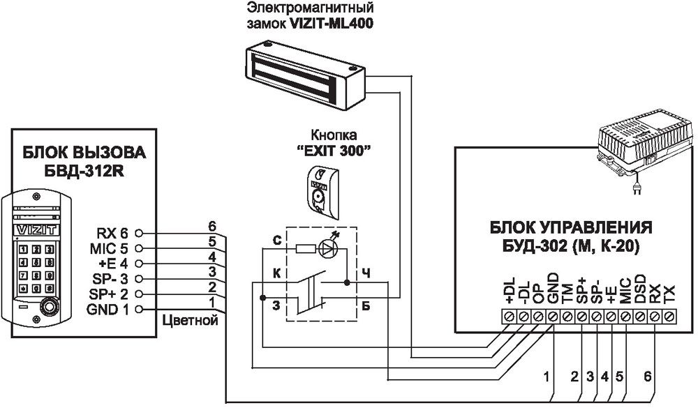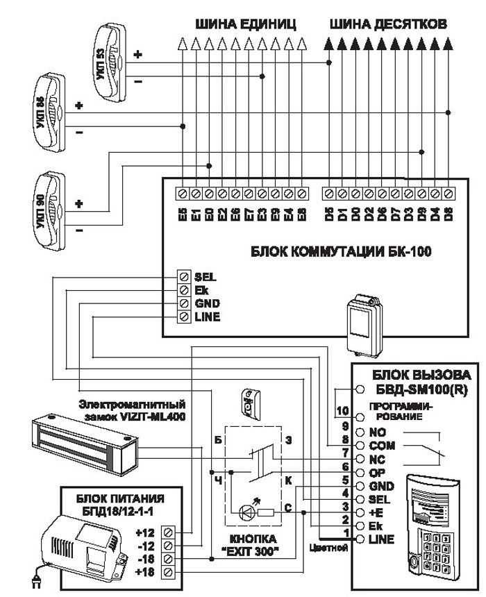איור זה מציג את המרכיבים העיקריים של הציוד הסטנדרטי. יחידת השיחה מותקנת מבחוץ דלת קדמית... יש לו מקשים לחיוג למספר הדירה, לוח מגע מיוחד. פוב מפתח אלקטרוני ("טאבלט") נלחץ עליו בכדי לפתוח את הנעילה האלקטרומגנטית. יחידת הבקרה בודקת שהקוד של מפתח זה תואם לדוגמא. מבפנים ניתן לכבות את ספק הכוח למנעול ולפתוח את הדלת באמצעות כפתור מיוחד.