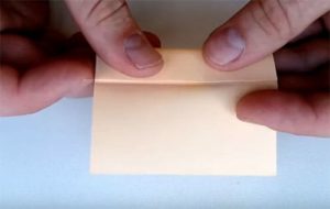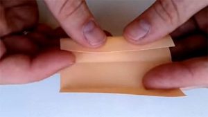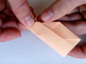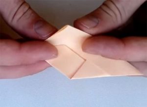 ראשית, קפלו את הסדין לשניים ליצירת קיפולים, ופרשו וקפלו כל צד לכיוון המרכז. כעת הופכים את הנייר ומקפלים את פינותיו לכיוון המרכז, ויוצרים טרפז. ניתן לקפל רק פינות הפוכות.