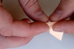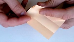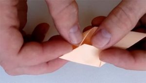לעבודה יצירתית, אתה זקוק לריבוע מגיליון נייר A4. יש לקפל את הריבוע באלכסון פעמיים, ולסמן את קווי הקיפול. יש צורך ליצור משולש, כשהוא תוחב פנימה את הקצה. כופף את הפינות החופשיות למעלה. פעולות כאלה חייבות להיעשות מכל צדדי הצורה המשולשת.