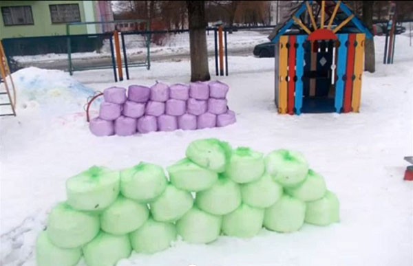 אם יש מעט או בכלל לא שלג, אבל יש כפור, אז שפכו מים צבעוניים לכפפות, כדורים בצורות שונות. ברגע שנוצר קרח, קליפות הכדורים נקרעות ומקבלות קישוט חצר מגניב.
