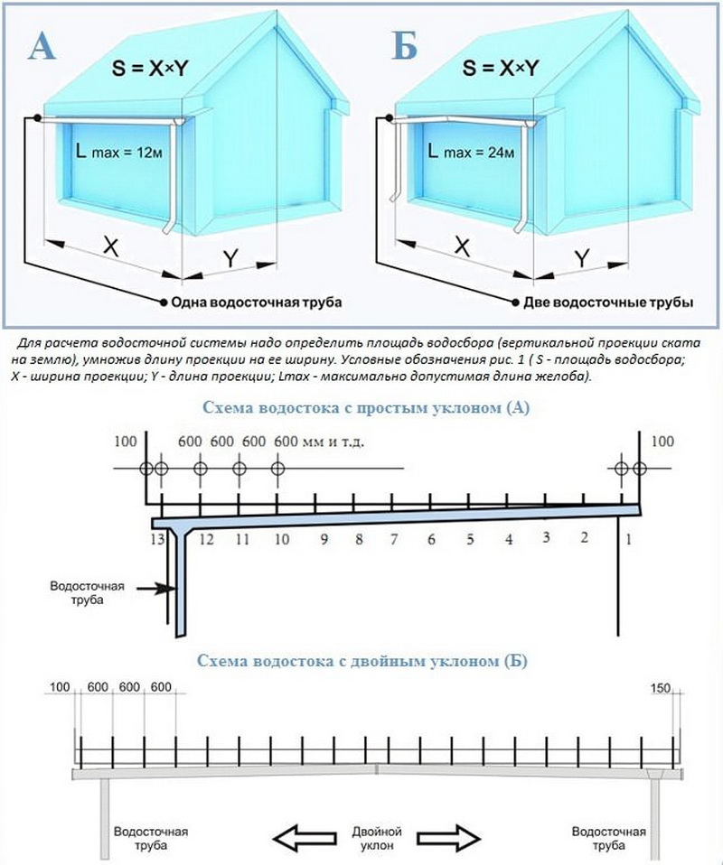 החישובים עצמם תלויים בסוג הניקוזים, אורך המדרון, גודל הגג. גודל המדרון נקבע על ידי מדי בית הספר הפשוטים ביותר. בואו נקרא לזה H = (A (אורך ההקרנה האופקית של קצה הגג) + B (גובה הגג) / 2) x C (אורך הגג).