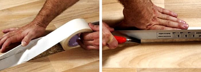 - הקו המשותף נחתך לאורך שני הבדים בו זמנית. סרגל מתכת משמש כתבנית.