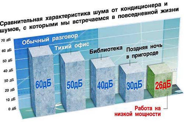 יצרנים רוסים מציעים דגמים עם סף רעש של עד 21 דציבלים, מזגנים מיפן, נתון זה הצטמצם ל -19 דציבלים. זה נעשה על ידי התקנת משתיק קול למכלולים פנימיים. דגמים עם רמת לילה של עד 26 דציבלים מוצעים לצרכן הכללי בקטגוריית מחירים משתלמת, בעוד שביום נתון זה אינו עולה על 30 דציבלים.