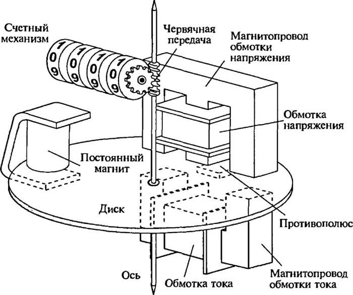 השנייה היא הסליל הנוכחי. זה יוצר זרם חילופין במכשיר, שמבחינת האינדיקטורים שלו שווה לזרם ברשת. כאשר שני הסלילים פועלים, נוצר שדה מגנטי הפועל על הדיסק העשוי מאלומיניום. תחת פעולת השדה, נוצרים כוחות אלקטרומגנטיים.לאחר מכן הם מסובבים את הדיסק שעל צירו קבוע מכשיר הספירה. האחרון מבוסס על ציוד תולעת שדרכו מועבר סיבוב לחוגה. ככל שהאות בתוך השדה המגנטי חזק יותר, כלומר ככל שצריכת החשמל גדולה יותר, כך הדיסק מסתובב מהר יותר.