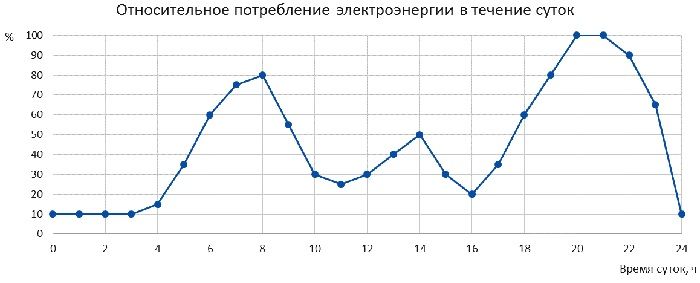 קודם כל, עליכם להבין מה פירוש התעריפים ולמה הם שונים. התמונה התחתונה מראה כיצד צריכת החשמל משתנה במהלך היום. זה מראה בבירור כי השיא העיקרי מתרחש בשעות הבוקר והערב, כאשר כל המשפחה מתכנסת בדירות. אבל בלילה הצריכה יורדת בחדות, כי כולם ישנים. לכן, ארגוני אספקת החשמל קבעו שני תעריפים: