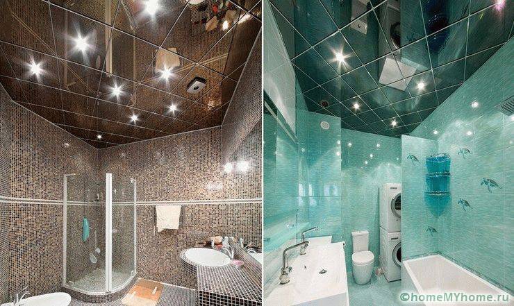 ניתן לקשט את תקרות האמבטיה בציפויים צבעוניים. משטחי זכוכית צבעונית או ויטראז 'נחשבים לפתרונות מקוריים.