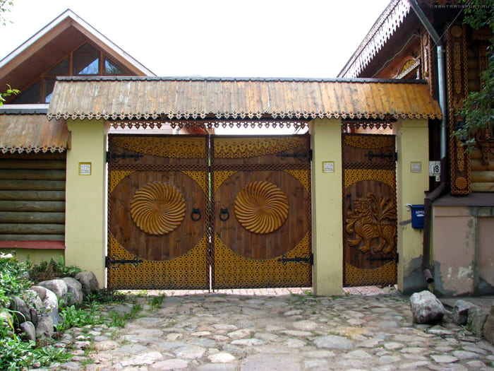 השימוש בשכבות מגולפות מגולפות מאפשר לך לשנות באופן קיצוני את מראה הכניסה לגן. חוט הפתיחה מחובר לעלה דלת הפאנל.