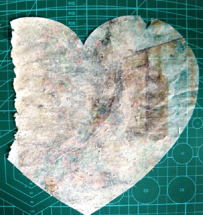 הבסיס מוכן ואז המשך לעבוד עם התדפיס: אתה צריך את התדפיס עצמו וספוג לשטיפת כלים. הניחו את התצלום עם הפנים כלפי מטה וסחו את הנייר, החלקו כדי לגלגל את השכבה העליונה.