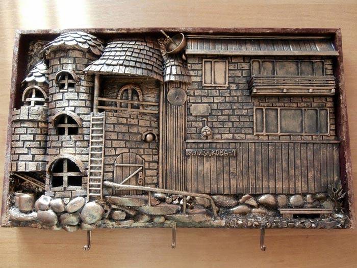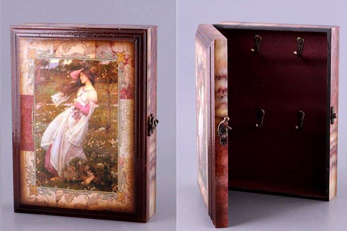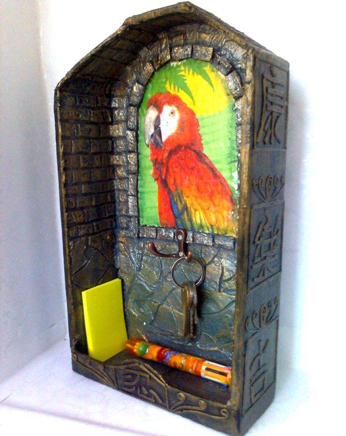 הערה! מחזיקי מפתחות דקורטיביים לקירות סגורים יכולים לבצע מספר פונקציות בבת אחת: בנוסף לאחסון מפתחות בקפידה, הם מסתירים פרטים לא רצויים של המסדרון, כמו דלפק או חוטים.