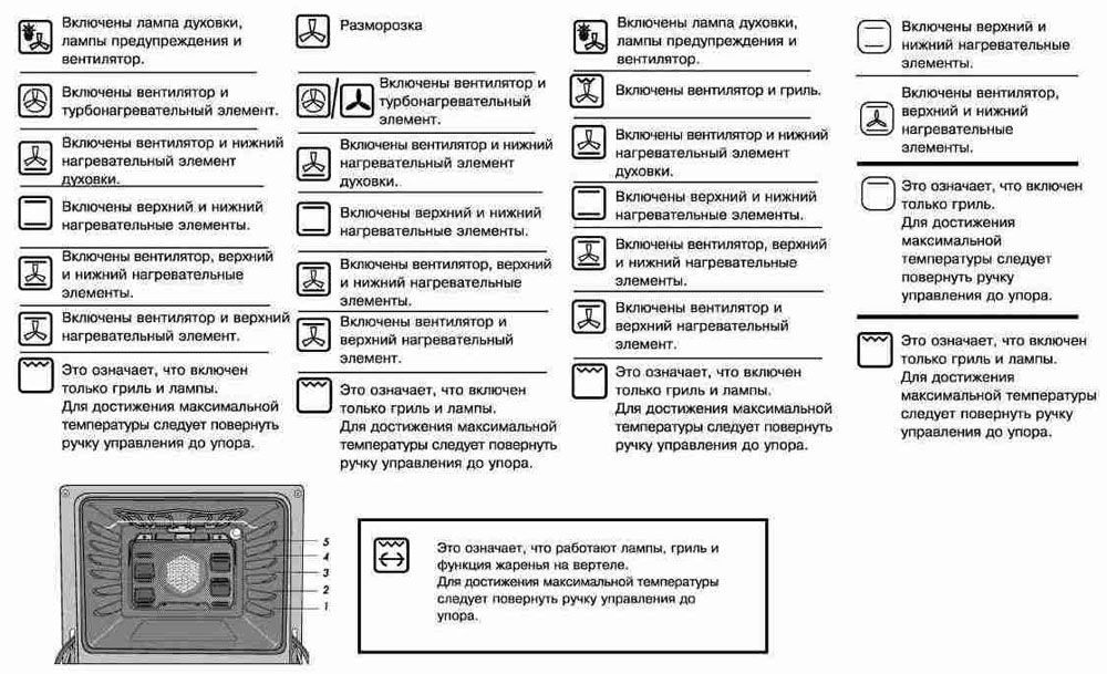 כבר בחנות, אי אפשר שלא להבחין בסמלים שונים בלוח הציוד המצביעים על טווח תפקודים. קל לנחש מה בדיוק אומר הסמל. אז, המקפים מציינים את גופי החימום, השיניים מציינות את פונקציית הגריל, והקונווקטור נמשך בצורה של מאוורר. על ידי הגדרת המצב הרצוי, תוכלו לטגן את המנה או להפוך אותה לפריכה. להלן תיאור הפיקטוגרמות, ביניהן בתמונה וסמל ההסעה בתנור.