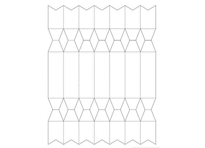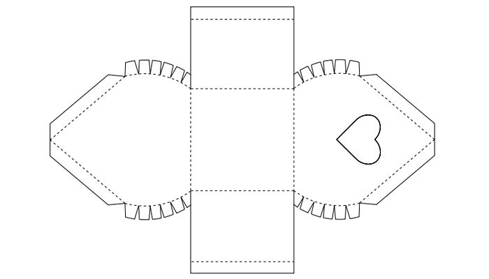 יש תבנית מוכנה להכנת אריזת מתנה עשה זאת בעצמך מקורית בצורת ממתק. מכיוון שההרכבה קלה יותר ממשקל קל, אתה יכול להכין כמה שיותר מוצרים כאלה שתרצה.