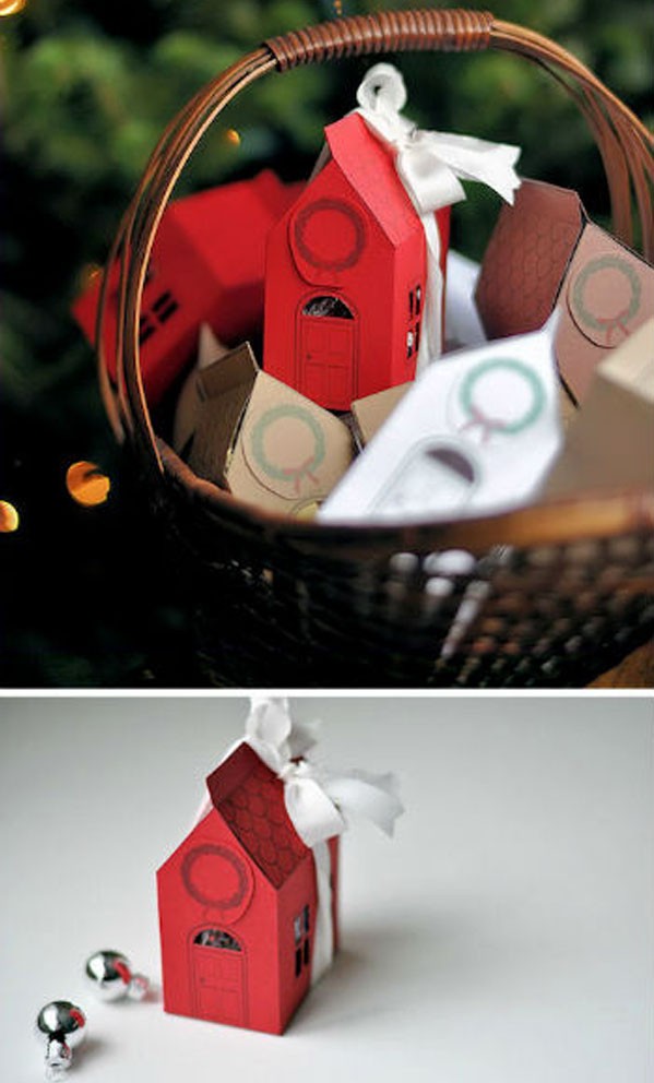 פיתרון מעניין שיכול לשמש גם כקישוט עץ חג המולד. אם אתה מכין הרבה בתים קטנים כאלה בבת אחת ותולה אותם על ענפי עץ חג המולד, אז אפילו להוציא את תכולת הקופסה, תליון יפה יישאר.
