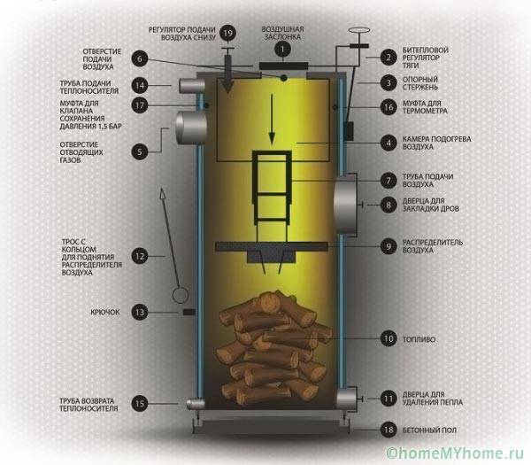 לדודים מכניים מונחים למעלה יש בדרך כלל גוף גלילי. לאחר ההעמסה, עצי הסקה מבעירים מלמעלה, מנחת אוויר מסיבית עם חורים מונמכת עליהם ומדידה את אספקת האוויר.