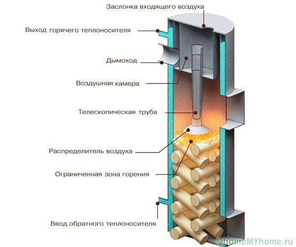 - תא תחתון - על ידי אוורור מאולץ נשאב לכאן גז פירוליזה, שנדלק על ידי זרבובית קרמית;
