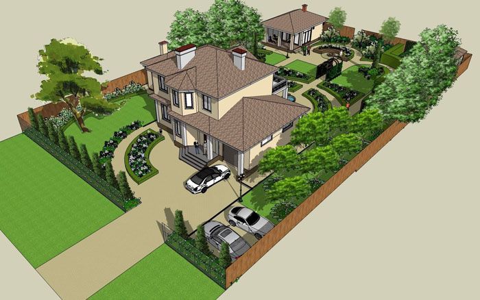 על פי גודל המגרש, הם מתכננים להציב מבנים פונקציונליים ואסתטיים שונים. סידור השטח הסמוך של בית פרטי מספק מוסך, ערוגות פרחים, רציף מול הבית, שביל לבית הארחה ולחצר האחורית, עצי נוי. החצר הקדמית היא חזית הבית, והתמונות מאשרות זאת.