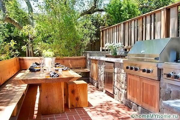 חָשׁוּב!עדיף לסרב לאפשרות של מטבח באוויר הפתוח בתנאי קווי הרוחב הרוסיים. שמש חמה, גשם וברד יכולים להביא להפתעות לא נעימות.