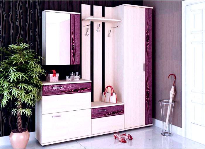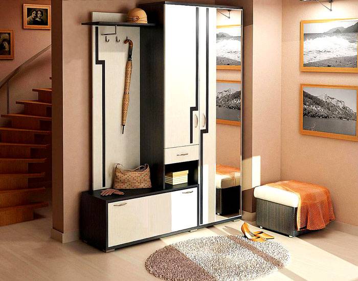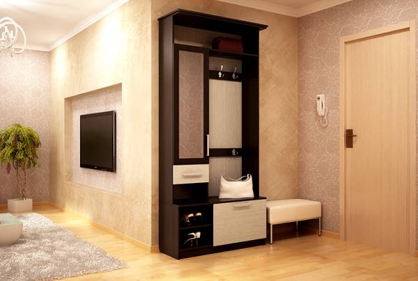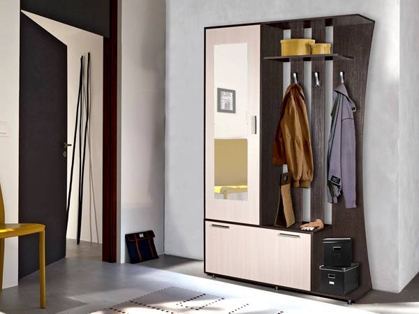 פריטים גדולים לקישוט הפנים במסדרון אינם נחוצים, הכל צריך להיות מעשי ביותר כאן.מהפרקטיות כדאי להתחיל מלהרים את המסדרונות במסדרון. בתמונה למטה, רהיטים שמתאימים לחלל קטן: