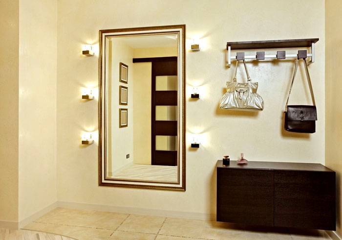 גישה מינימליסטית זו תעזור לפתור את כל המשימות. את המראה ניתן אפילו להניח על הדלת. ותאורה נכונה תעזור להכות את החלל ולהפוך אותו לגבוה יותר ומרווח יותר מבחינה ויזואלית.
