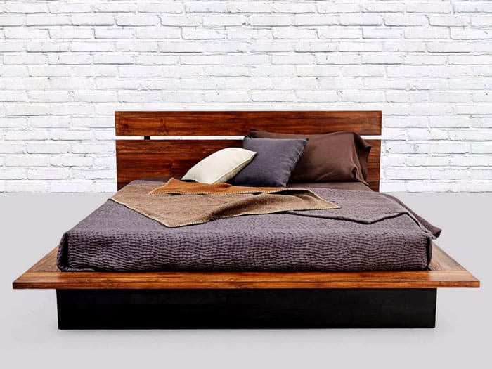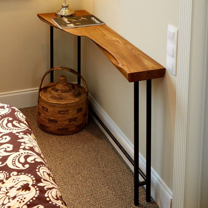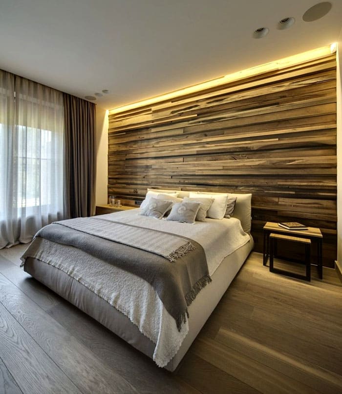 הארון המובנה מוסתר מאחורי לוחות עץ, והמיטה עשויה מחצלות עור שתואמות את הסגנון. שטח אחסון נוסף הוא זוג שידות ליד המיטה