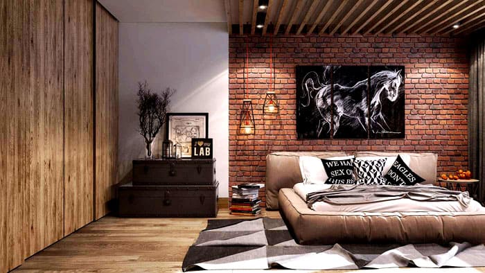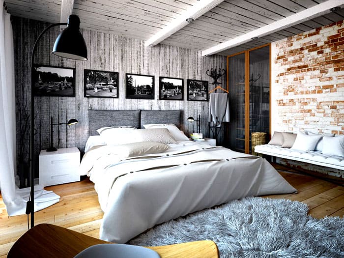 חדר שינה קטן מעוצב בכל מסורות הלופט החל מקישוט ועד רהיטים וטקסטיל. אין עומס בחלל עם פרטים קטנים.