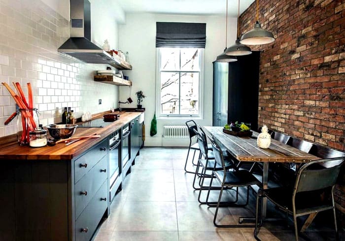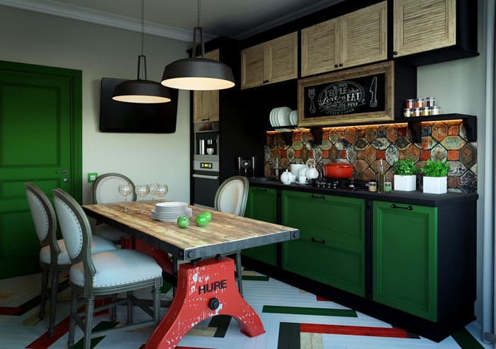 בדרך כלל, שטח קטן מוקצה למטבח אך ורק בהתאם למטרה המיועדת. משטחי השיש צריכים להיות מסיביים. דלפק בר עם כסאות גבוהים, כמות קטנה של מכשירי חשמל ביתיים מתקבל בברכה. ראוי לקשט את המטבח בצילומי החיים הבוהמיים של המאה הקודמת ובמנורות תלייה מתאימות.