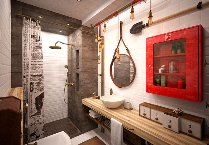 החלפה יצירתית של ארונית בנאלית עם פריט המסוגנן כארון קיר כבאי. תאורה משמשת לא רק כמקור אור, אלא גם כתפאורה