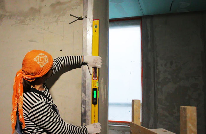 - עיבוד הקירות בחדר מתחיל מהפינות, ואז תערובת הגבס מוחלת על המפרקים של כל המבנים, ורק לאחר מכן טיח את השטח העיקרי של משטח העבודה;