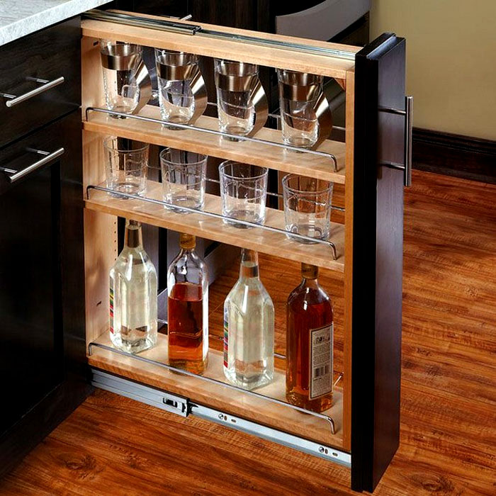 תוכלו להשתמש בנישה החינמית בין ערכת המטבח למכשירי חשמל ביתיים, למשל, באמצעות מדף יציאה מובנה על סגרי דלתות איכותיים עם מיסבים. לאחסון כזה, ככלל, יש כמה שכבות. התוצאה היא מיני בר מעץ קומפקטי.