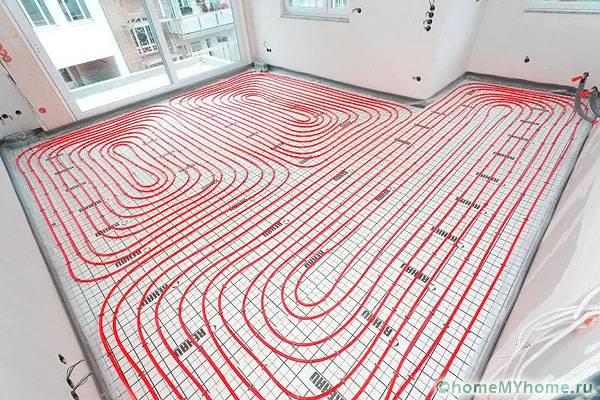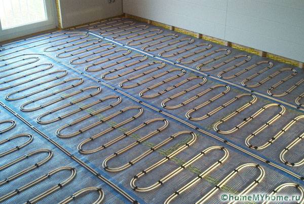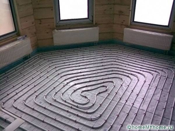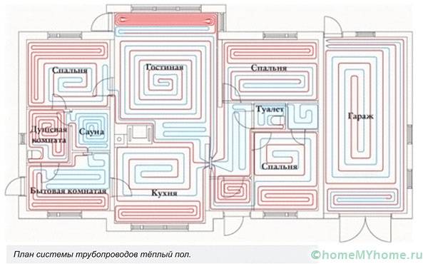 מידע מועיל! סוג דיאגרמות ההתקנה של רצפות מחוממות במים בבית פרטי תלוי בשיטת החימום ובצורות הגיאומטריות של החדר. החימום העיקרי נעשה בספירלות ובצירים כפולים, ואילו חימום נוסף נעשה בצירים בודדים.