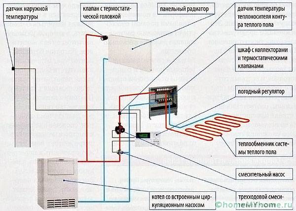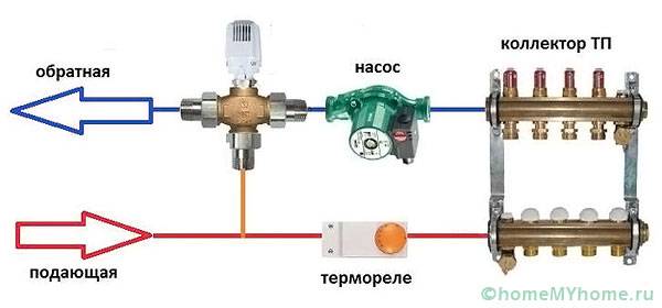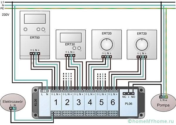 דיאגרמות חיווט של רצפות מחוממות במים בבית פרטי משלימות לעיתים קרובות עם מחליף חום. זהו מכשיר המחליף את נוזל הקירור בבניית רצפות ומערכת החימום.