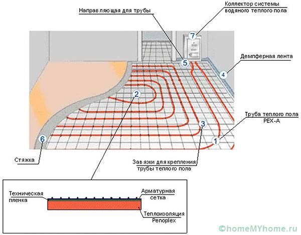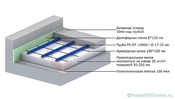 מרכיבי מנגנון החימום התת רצפתי הם גופי חימום בתוך הרצפה. בעת בחירת תרשימי חיווט לרצפות מחוממות במים בבית פרטי, יש לזכור כי למבנה כזה יש מבנה שכבתי.