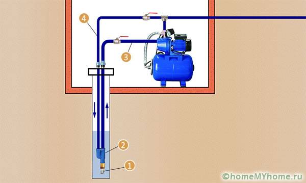 ערכת אספקת מים דו-צנרתית של בית פרטי עם תחנת שאיבה (1 - שסתום בקרה עם פילטר, 2 - מפליט, 3 - קו יניקה, 4 - צינור מחזור)