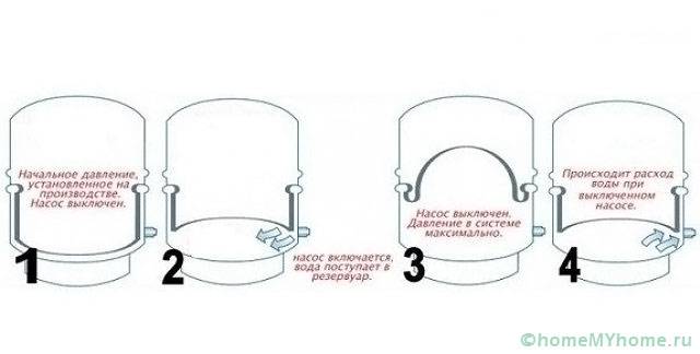 לאחר תחילת ההתקנה, המשאבה מעלה מים מהבאר ואז מפנה אותם אל המצבר. קיבולת הצבר מחולקת לשני חלקים. אחד מהם מכיל אוויר בלחץ, והשני מיועד למים. כשמפעילים צרכני מים, כמות המים במיכל פוחתת והלחץ במערכת יורד.