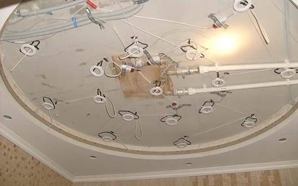 יש להחליט על תאורה מראש. משמש בדרך כלל בתקרות תלויות זרקורים... חישוב מוטעה של מיקומם הוא רגע חשוב של עבודה. התקנת המכשירים עצמם מתבצעת לאחר פילוס ה- PVC. על אודות אורות תקרה לד לתקרות נמתחות קרא במאמר נפרד.