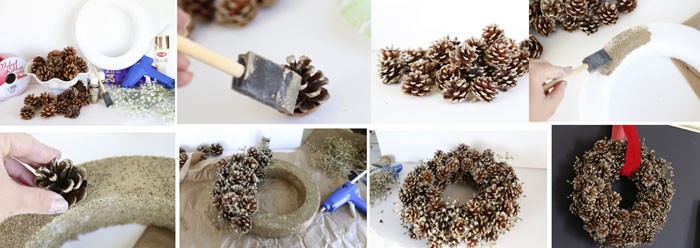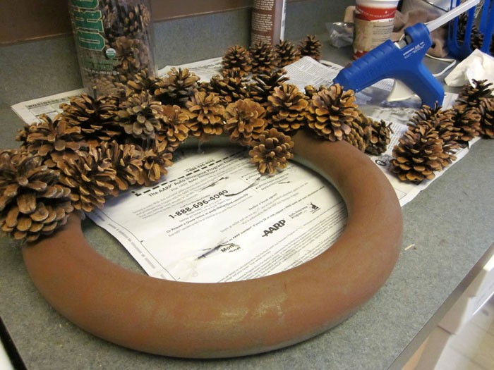 קונוסי אשוח משולבים עם הגפן. הגפן נאספת מראש ומעוותת אותה לזר, או נקטפת בריסים ולפני העבודה הריסים ספוגים ומייבשים מעט