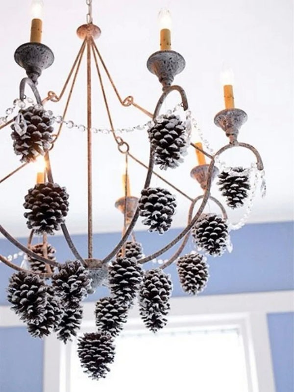 רעיון נהדר יכול להיות תפאורה ממלאכות השנה החדשה העשויה קונוסים וענפים בצורת עיטור נברשת. כדי להפוך את התאורה בחדר לאווירתית באמת, יהיה עליכם להכין את החומר: להבהיר את הבליטות, לצבוע או פשוט לגלגל בדבק ולפזר בו נצנצים.