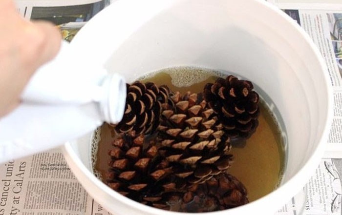 ראשית, אסוף את כל התפרחות המחטניות שנפלו ונקה אותן משאריות שרף. שמנו הכל במיכל עם חומר אלקליין - למטרה זו, מנקה הצינורות "שומה" מתאים. לאחר 2-3 שעות יש לשטוף את הבליטות ולהשאירם לייבוש.