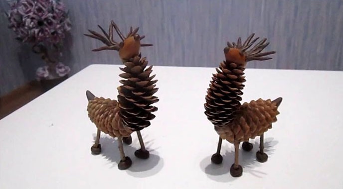 מפלסטלינה וקונוסים ארוכים, צבאים יפים יתבררו. הם תלויים על ידי המותניים, מכיוון שהראש יהיה שברירי מדי. כדי למנוע מהצבי להשתלשל ולשבור את קרניים על ענפי אורן, עדיף לחבר אותם לעץ באמצעות חוט
