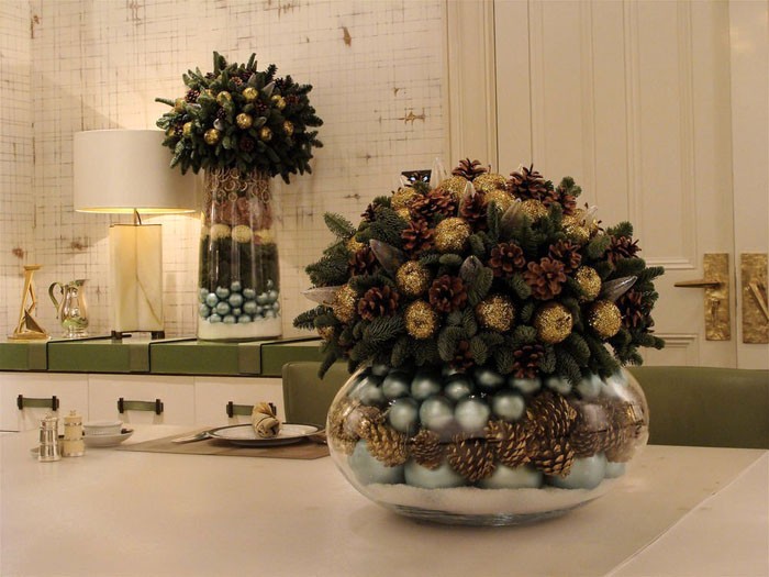 הם תלו את הזר, קישטו את העץ ואפילו לא שכחו את הכיסאות והמסגרות על הקיר. עכשיו נתחיל לקשט משטחים. אי אפשר לשתוק על העובדה שחומר טבעי נהדר ליצירת טופיארי.