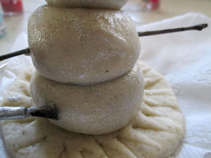 וודאו שהגושים אינם גדולים מדי, עבודה כזו תתייבש לאורך זמן רב וסדקים עלולים להתרחש. התקן את המסגרת. זה יכול להיות מוט שנתקע בתוך עוגת בצק מלח, חפץ קטן ויציב שיכול לשמש כמוט. הילד מכין שלושה קולובוקים, מניחים כל אחד על המוט בסדר יורד. עזור לפסל עיניים ועטים. כדי לתקן את החלקים, מקום ההדבקה משומן במים.
