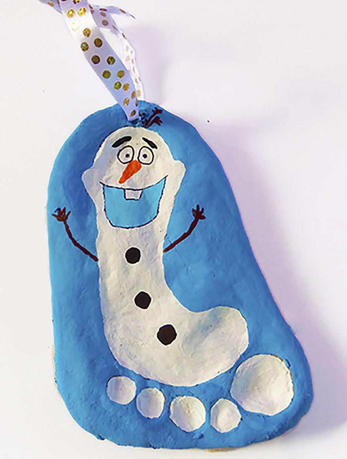 אנחנו מכינים עוגה קטנה עם הילד ועוזרים לו להשאיר עליה טביעת רגל. ברגע שהמוצר מתייבש, תוכלו לתת לילד לצבוע אותו בצורה של איש שלג