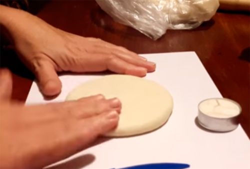 נכין מיד את כל מה שאתה צריך למלאכות מבצק מלח ונלמד כיתת אמן. אנחנו לוקחים נר עגול קטן, בצק מוכן, מכבש שום, סכין פלסטיק, מקום עבודה, מערוך.