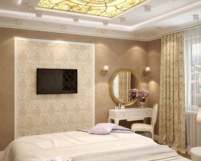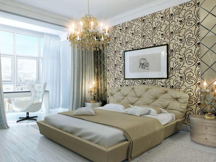 טפטים בהירים מתאימים מאוד לקלאסיקות הישנות והטובות בחדר השינה. אתה יכול ליצור תאים מלכותיים על ידי שילוב של גווני שמנת, בז 'וקרם ועיצוב תבנית נוי מובטחת. אתה יכול להישאר על הגרסה הקלאסית וללא סלסולים.