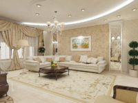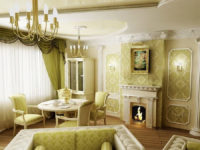 דירות מעטות יכולות להתפאר בסלון בעל שטח מספיק עבור אח, רהיטים ופריטים פנים אחרים בסגנון קלאסי. במקרה זה, הדגש בעיצוב הוא על הטפט. ככלל, הקלאסיקה בחומרי הגמר מאופיינת בטווח צבעים עשיר למדי ובדפוסים "מסורתיים":