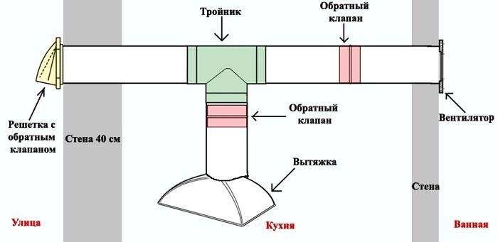 הערה! כדי להגביר את יעילות המערכת, אורך הערוץ מצטמצם, והיציאה לרחוב מתבצעת ישירות בקיר החדר. במקרה זה, הוא מצויד בשסתום נוסף החוסם את זרימת האוויר מבחוץ לאורך נתיב זה.