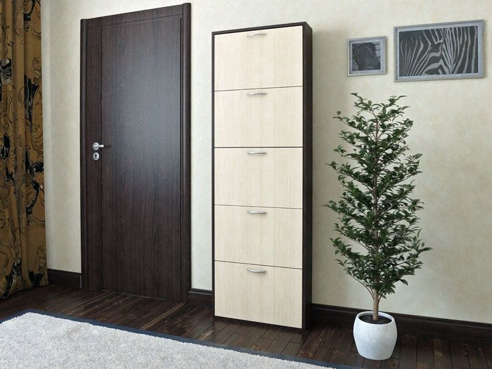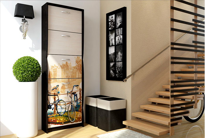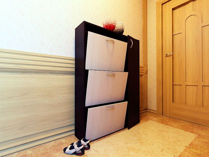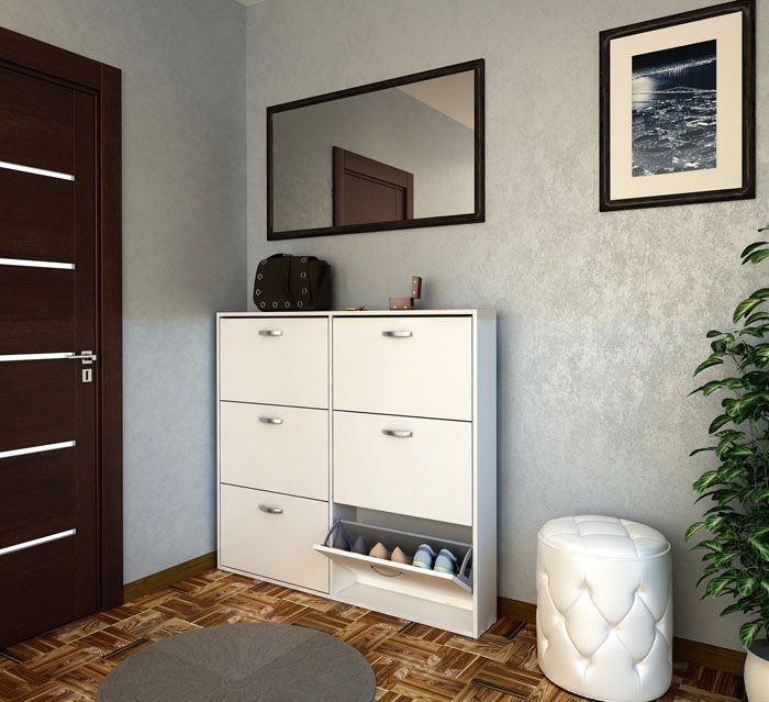 מגירות נעליים לנעליים מעוצבות בנוחות: הן חוסכות מקום משמעותית במסדרונות קטנים. המעשיות טמונה בפתיחת הדלתות בזווית של 45 מעלות, מה שגורם לנעליים להיות אנכיות.